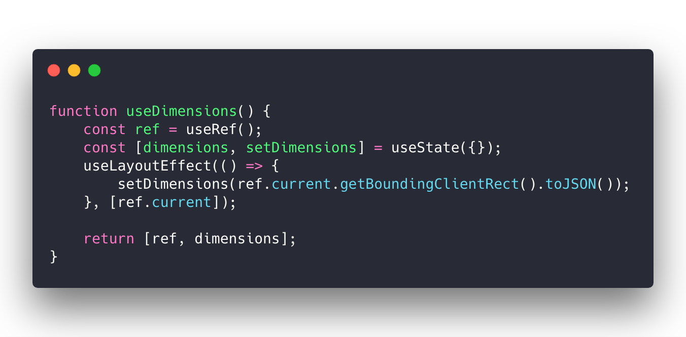 useRefcreates a React.ref, lets you access the DOMuseStategives you place to store/read the resultuseLayoutEffectruns before browser paint but after all is knowngetClientBoundingRect()measures a DOM node. Width, height, x, y, etctoJSONturns a DOMRect object into a plain object so you can destructure