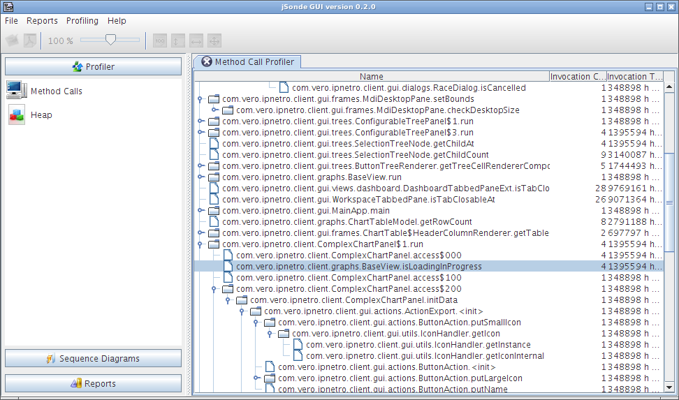 Select "Sequence Diagrams" pane and you'll see a tree with classes of your applications. The leaves of this tree are "root" method calls discovered by jSonde agent.
