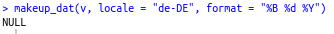 ``` v <- as.Date("2020-03-04") makeup_dat(v, locale = "de-DE", format = "%B %d %Y") ```