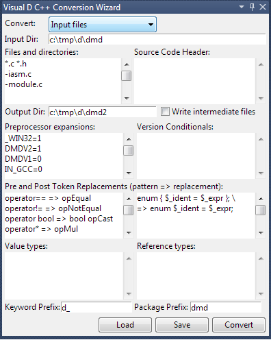 If you want to span the rule across multiple lines, use the \ line splicing mechanism. - Value/reference types: sometimes the parser or the converter stumbles across unknown identifiers that might be types. You can help it specifying them here. Value or reference semantics determine whether an indirection is removed from pointer declarations. - Keyword prefix: identifiers that are keywords in D, but not in C++, are prefixed with the given text. - Package prefix: module names are prefixed with the given package identifier - Load/Save: save and restore the current dialog settings - Convert: start the conversion