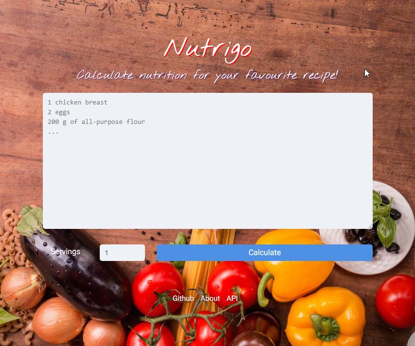 $ docker-compose up nutrigo--Note that parsing third-party websites is only possible by using API Endpoint /api/calculate-from-url